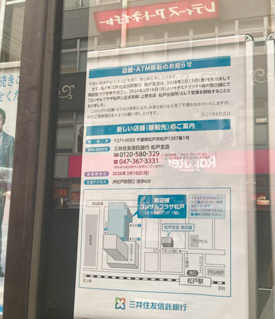 三井住友信託銀行松戸支店が現在の場所から松戸駅直結のキテミテマツド1階に移転することになりました。