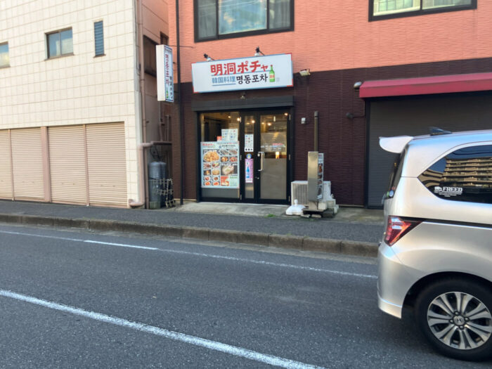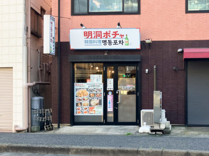 白地に赤い文字で「明洞ポチャ」と書かれた看板が目を引く、本格的な韓国料理を提供するお店です。