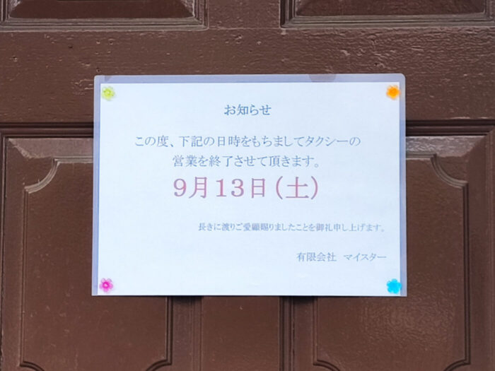 西馬橋1丁目の「有限会社 マイスタータクシー」が9/13(土)をもって営業を終了