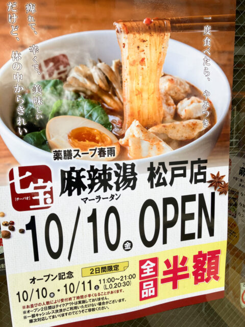 【オープン日判明】松戸駅西口「七宝麻辣湯」が10月10日オープン!オープン2日間は全品半額セールも実施