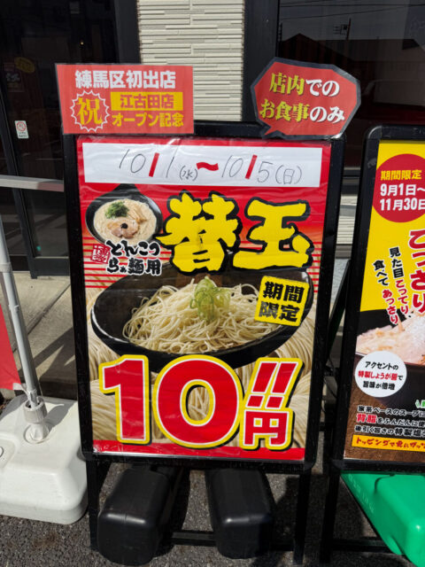 練馬区初出店のオープンを記念して、替え玉がなんと10円で楽しめる特別キャンペーンが実施されています。