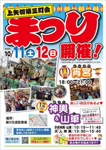 松戸市上矢切地区で、2025年10月11日(土)・12日(日)の2日間、「上矢切第三町会 まつり」が開催されます。