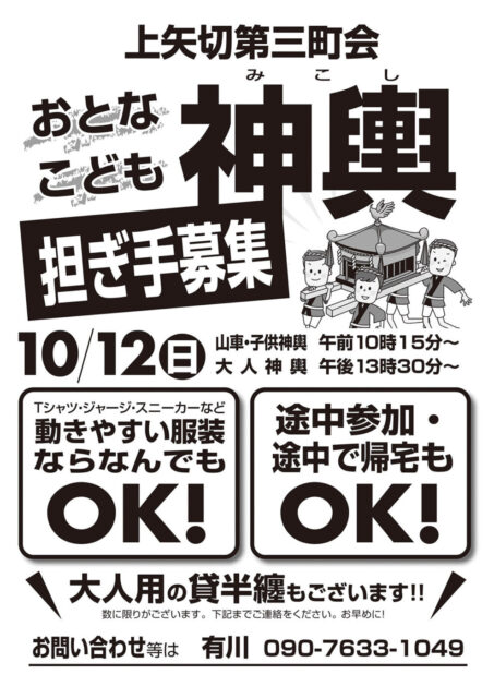 子供神興は当日の飛び込み参加も歓迎とのことですので、お子様連れのご家族はぜひ参加してみてはいかがでしょうか。