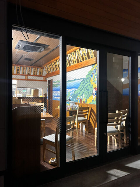 建物内部を見ると、和風の雰囲気が漂う内装となっています。窓際には木製のテーブルと椅子が配置されており、壁には浮世絵風のイラストや提灯が飾られているのが確認できます。
