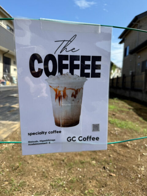フェンスには「The COFFEE specialty coffee GC Coffee」と書かれた告知が掲示されています。