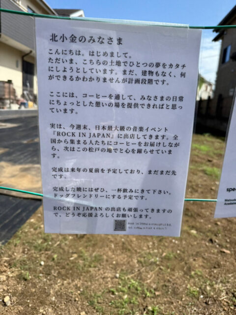 空き地に掲示された告知には、「北小金のみなさま」に向けた挨拶文が記されています。