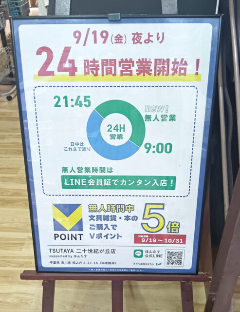松戸市と市川市の市境にある「TSUTAYA 二十世紀が丘店」が、9月19(金)より24時間営業を開始しました。