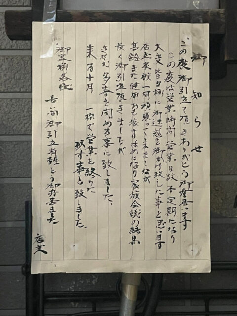 手書きの貼り紙には、長年の感謝の気持ちがつづられています。