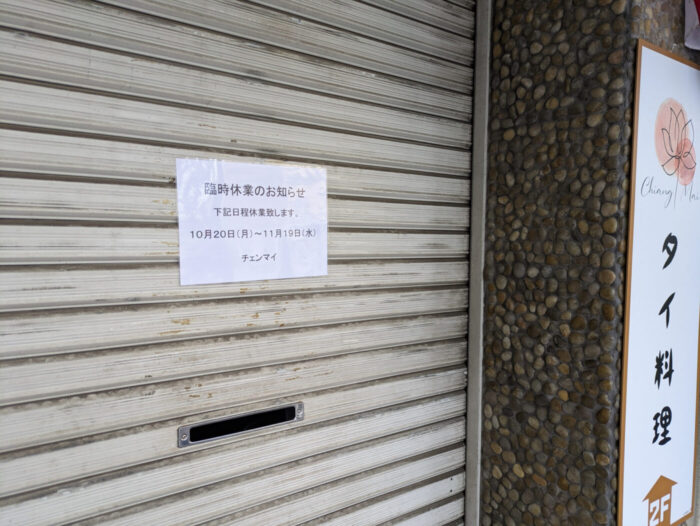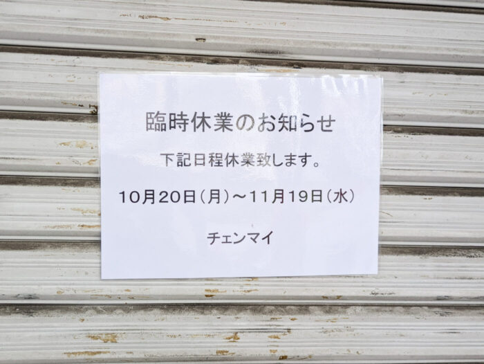 五香駅前のタイ料理・マッサージの「チェンマイ」さんが11/19(水)まで臨時休業されています。