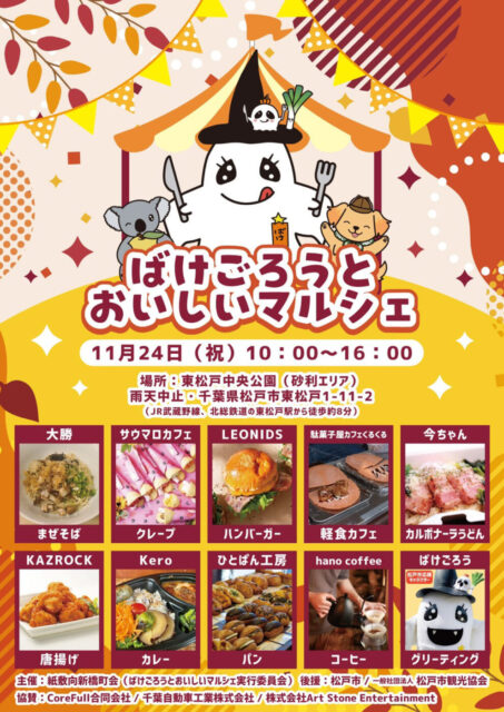 11/24(月・祝)東松戸中央公園で「ばけごろうとおいしいマルシェ」開催!松戸市応援キャラクター「ばけごろう」とグルメが大集合!