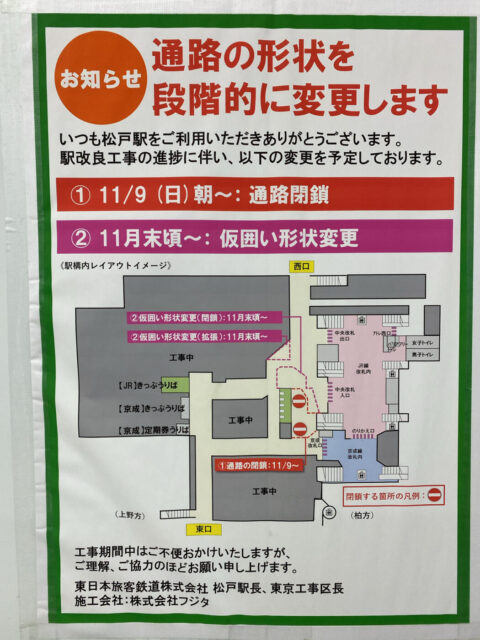 松戸駅の改良工事に伴い、11月9日(日)朝から駅構内の一部通路が閉鎖され、段階的に通路の形状が変更されることになりました。