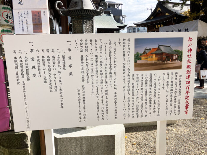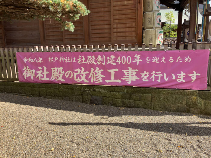境内には「令和8年 松戸神社は社殿創建400年を迎えるため御社殿の改修工事を行います」と記された横断幕が掲げられ、長い歴史を持つ神社の重要な節目であることを告知しています。
