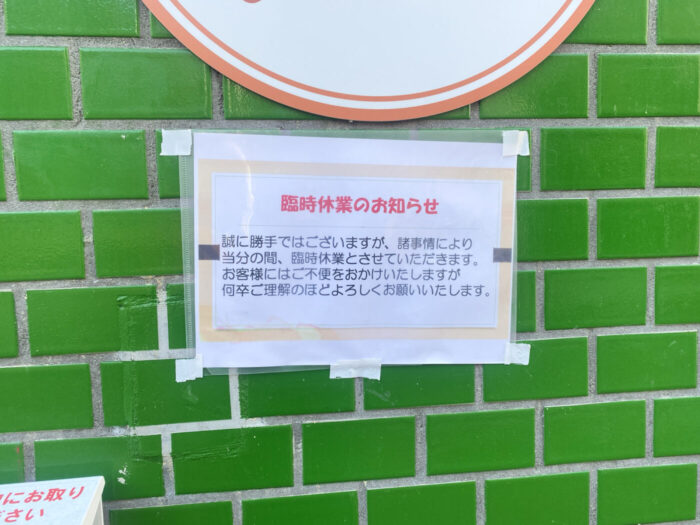 お店の看板の下には休業を案内する張り紙が掲示されていました。
