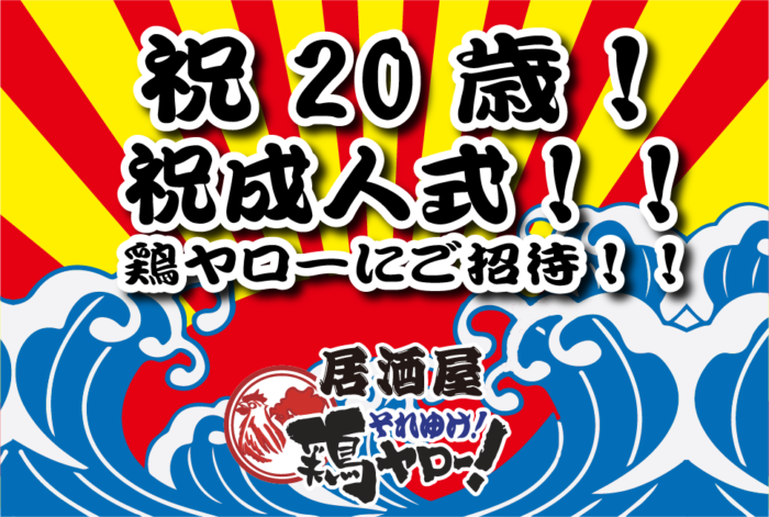 松戸駅近くの人気居酒屋「鶏ヤロー松戸店」(松戸市本町4-8)を運営する株式会社鶏ヤローが、今年度20歳になる方を対象とした「成人式おめでとうキャンペーン」を実施しています。