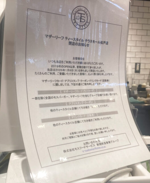 テラスモール松戸で本格紅茶を楽しむ事ができた「マザーリーフ ティースタイル」が、1月8日(木)で閉店します。
