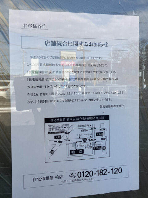 八ヶ崎8丁目の「住宅情報館 松戸店」が柏店と統合のため閉店していました
