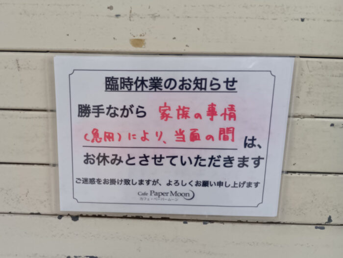臨時休業を案内する張り紙があり「家族の事情(急用)」となっています。再開日に関する記載はありませんでした。