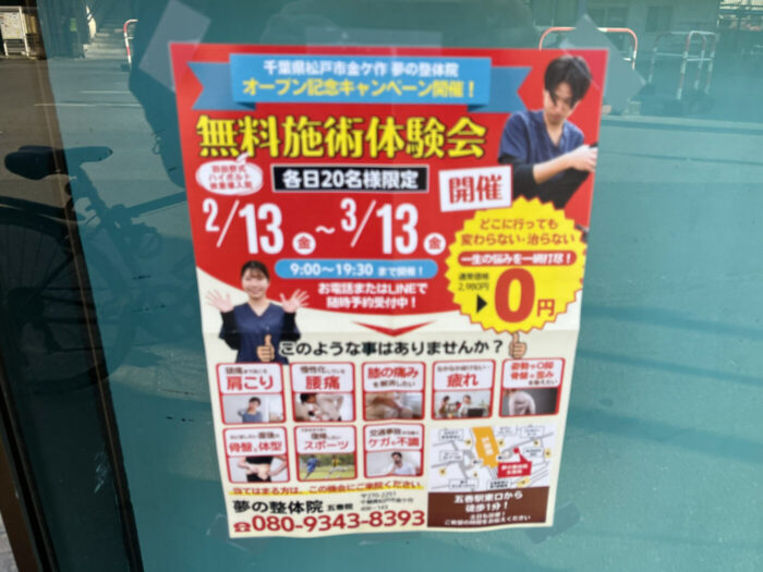 五香駅東口前に「夢の整体院 五香院」がオープン予定、2/13(金)〜3/13(金)各日20名様限定の無料施術体験会