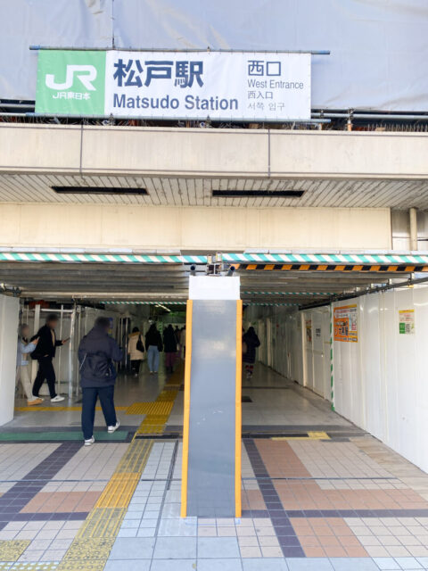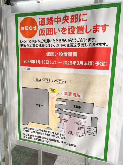 松戸駅西口の通路中央に仮囲いが設置、駅改良工事に伴い2026年3月末ごろまで