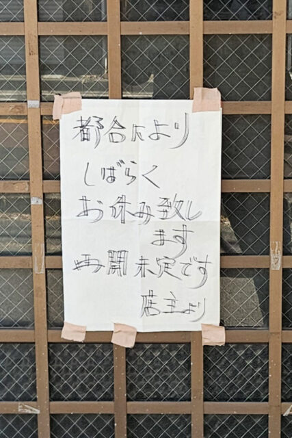 店舗の格子戸には手書きの案内が貼られており「都合により しばらく お休み致します 再開未定です」とのメッセージが記されています。シンプルながらも丁寧な文面から、急な事情による休業であることが伺えます。