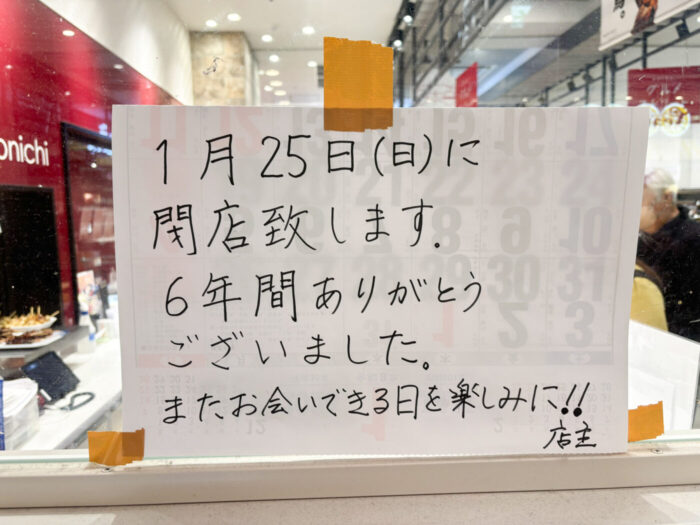 店舗のガラス面に掲示された手書きのメッセージには、「1月25日(日)に閉店致します。6年間ありがとうございました。またお会いできる日を楽しみに‼ 店主」との心のこもった言葉が記されています。