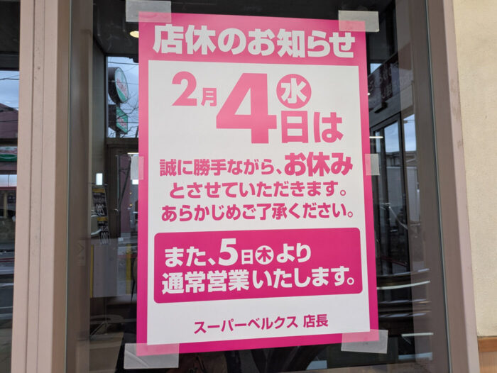 五香1丁目のスーパー「ベルクス 五香元山店」が2/4(水)が臨時休業となります。