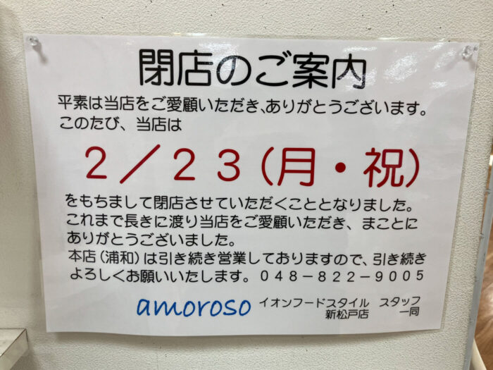 イオンフードスタイル新松戸店1階の雑貨店「amoroso」が2/23(月・祝)をもって閉店される事が分かりました。