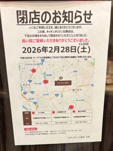 五香2丁目のお弁当・惣菜の「キッチンオリジン 五香店」が2/28(土)をもって閉店される事が分かりました。