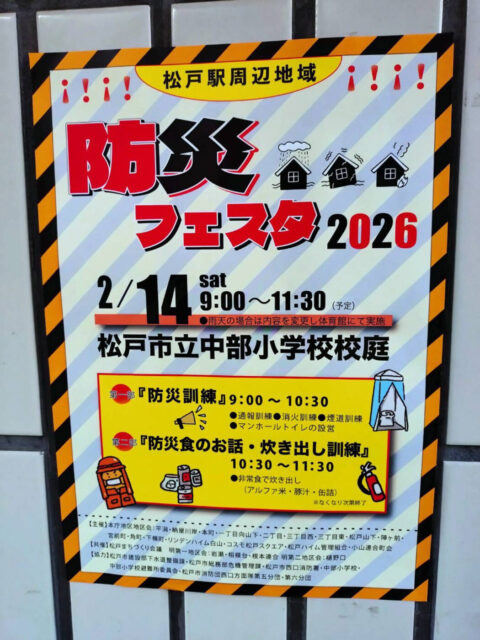 2/14(土)松戸市立中部小学校にて「松戸駅周辺地域 防災フェスタ」が開催、防災訓練に防災食のお話に、炊き出し訓練【2026】