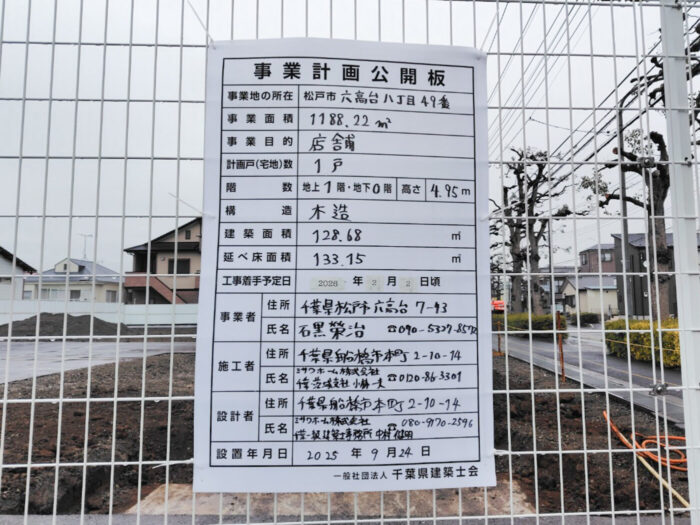 六高台8丁目、マツモトキヨシの隣の駐車場に「事業計画公開版」が掲示、店舗ができるみたい