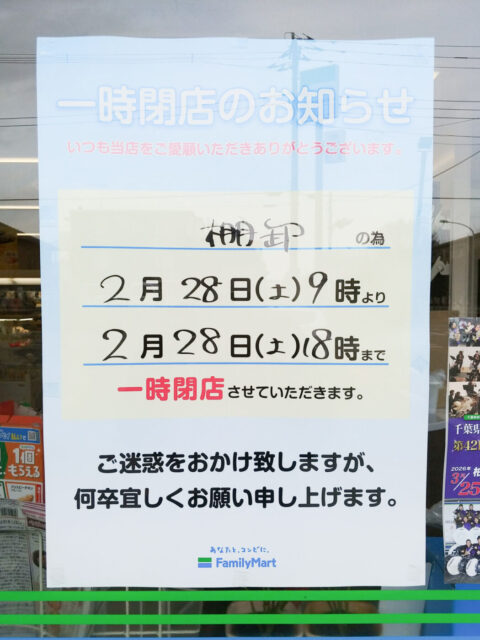 ファミリーマート 常盤平六丁目店が棚卸しのため2/28(土)9時〜18時まで一時休業