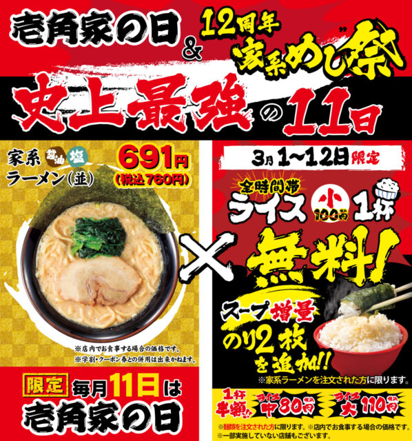 横浜家系ラーメン「壱角家」で、3月1日から12日までの12日間連続で「家系めし祭り」が開催されます。さらに毎月11日は「壱角家の日」として、家系ラーメンが特別価格で提供されます。