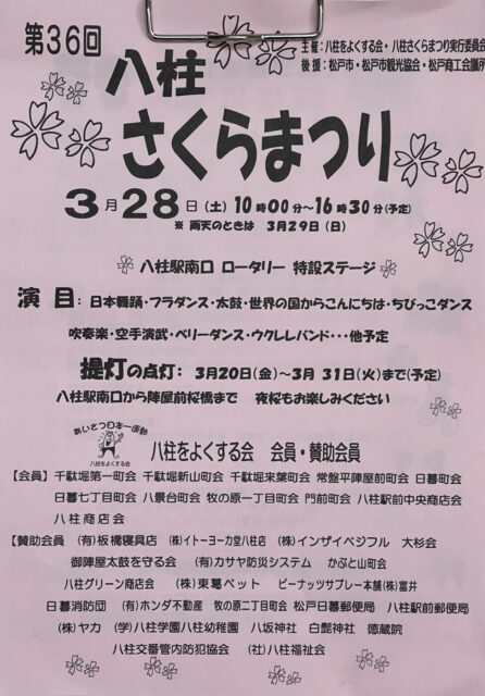 3/28(土)八柱駅南口ロータリーにて「第36回 八柱さくらまつり」が開催されますよ。