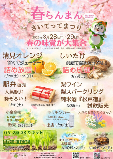 さいてってにて、2026年3月28日(土)29日(日)に「春らんまんさいてってまつり」が開催されます。梨スパークリングワインや梨ワインの試飲販売、詰め放題、バケツ稲づくりキットの配布など、楽しいイベントが盛りだくさんです。