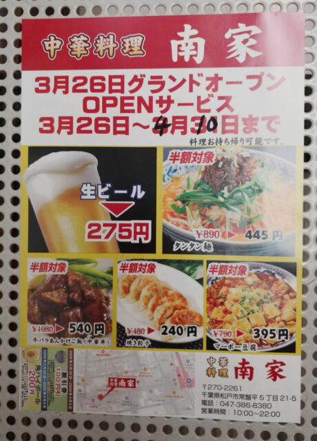 五香駅西口に「中華料理 南家」が3/26(木)オープン、ちょい飲みセットや、2,000円のコース料理など
