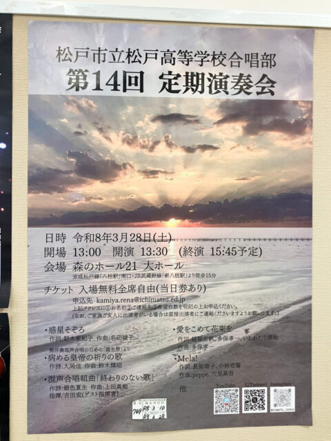 3/28(土)森のホール21で「松戸市立松戸高等学校合唱部 第14回定期演奏会」開催、ゲスト指揮者・吉田宏氏を迎えて無料公演