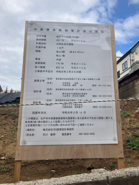 松戸市千駄堀で新たな共同住宅の建設が始まります。木造3階建て、18戸の集合住宅で、2026年3月25日頃の着工を予定しています。