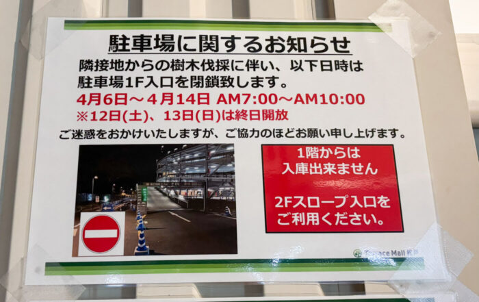 テラスモール松戸の駐車場1階入口が4/6(月)から14(火)まで閉鎖、樹木伐採工事のため2階スロープから入場に