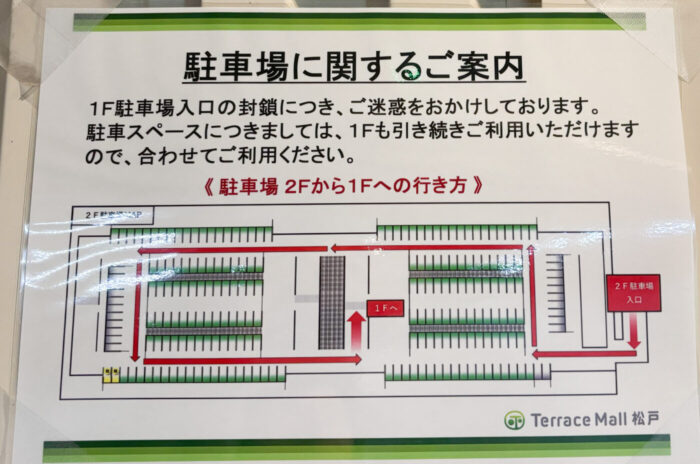 工事期間中に車でテラスモール松戸を訪れる場合は、通常の1階入口ではなく2階スロープから駐車場に入場する必要があります。