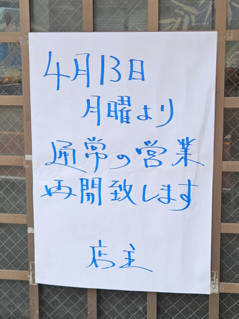 休業されていた、松戸市小根本の居酒屋「酒食処円居」さんが4/13(月)から通常営業を再開
