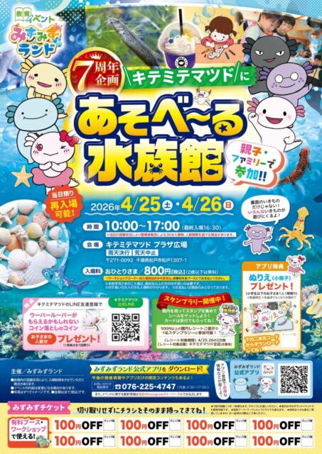 キテミテマツド1Fプラザ広場にて、2026年4月25日(土)・26日(日)に7周年企画「あそべ~る水族館」が開催されます。
