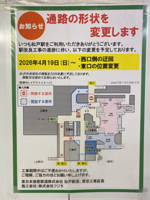 松戸駅改札前の通路が4/19(日)から形状が変更に!さらにJR中央改札は夏に移転を予定