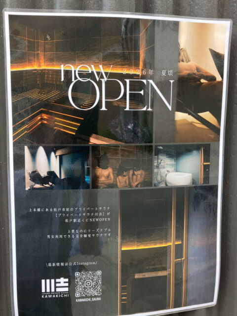 「プライベートサウナ 川吉」の新店舗が2026年夏にオープン予定です。松戸市松戸1299-2、まり松戸薬局の隣に位置し、松戸駅東口から近い立地となります。