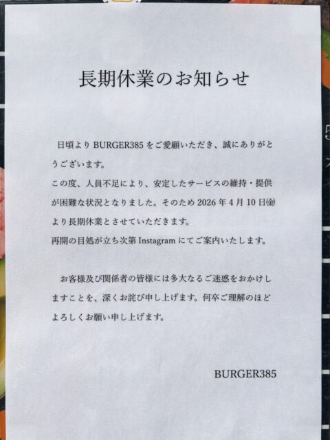 五香駅近くの牛100%の本格バーガー店「BURGER 385」が4/10(金)から長期休業、人手不足が理由