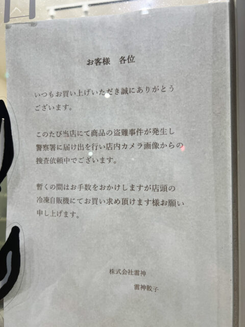 張り紙によると盗難事件が発生し、警察に盗難届を出し、店内のカメラ画像から捜査を依頼しているとの事です。