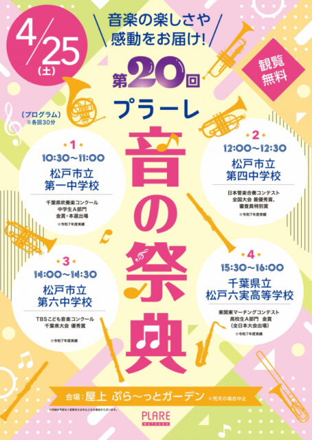 プラーレ松戸 屋上ぷら~っとガーデンにて、2026年4月25日(土)に「第20回 プラーレ音の祭典」が開催されます。