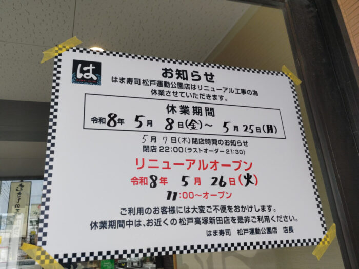 松戸新田駅近くの回転寿司チェーン「はま寿司 松戸運動公園店」が改装工事のため5/8(金)から休業、5/26(火)リニューアルオープン予定